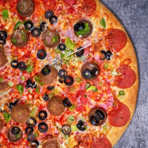 Mozzarella, Pepperoni, Crumbled Italian Sausage, Bacon, Mushrooms, Green Pepper, Red Onion
